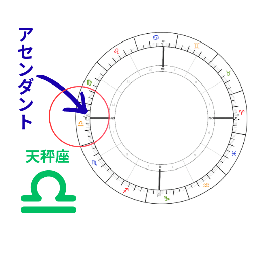 このホロスコープでは、横の太い線が天秤座のところにありますので、この場合、アセンダントは天秤座になります。